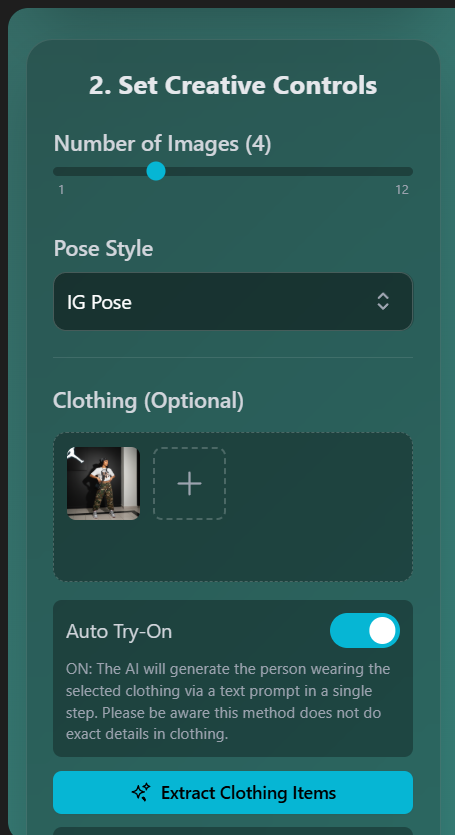 Garment Grabber takes your completed model and seamlessly places it into new environments while preserving lighting, scale, and realism. This is one of our most powerful tools for fashion, editorial, and promotional imagery. It is as of date the ONLY ai tool that give you 3D placement of your model in a workspace.